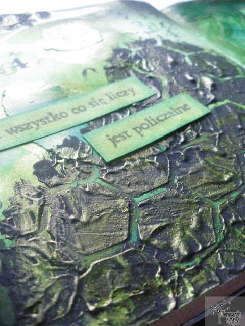 W pracy wykorzystałam skrawki papieru Zapach Lasu CraftyMoly, Distress Inks, bardzo stare stemple-cyfry, zieloną farbę akrylową, pastę modelującą Ayeeda Medium zmieszaną z czarną farbą, którą po zaschnięciu pomazałam błyszczącą zieloną farbą, żeby uwydatnić fakturę.